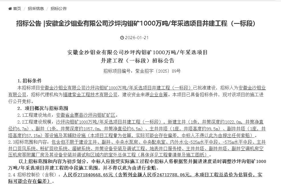 股權(quán)合作敲定僅兩日,1月21日,沙坪溝鉬礦便迎來實(shí)質(zhì)建設(shè)關(guān)鍵動(dòng)作——安徽金沙鉬業(yè)有限公司發(fā)布沙坪溝鉬礦1000萬噸/年采選項(xiàng)目井建工程(一標(biāo)段)招標(biāo)公告(項(xiàng)目編號:紫金招字〔2025〕89號),由福建紫金工程技術(shù)有限公司擔(dān)任招標(biāo)代理,標(biāo)志著項(xiàng)目從審批階段正式轉(zhuǎn)入工程實(shí)施環(huán)節(jié),資源變現(xiàn)時(shí)間表進(jìn)一步清晰。本次招標(biāo)聚焦井下核心設(shè)施建設(shè),招標(biāo)控制價(jià)(含稅)約2.72億元,涵蓋主副井、井塔及配套系統(tǒng),是300億總投資項(xiàng)目落地的重要開篇。