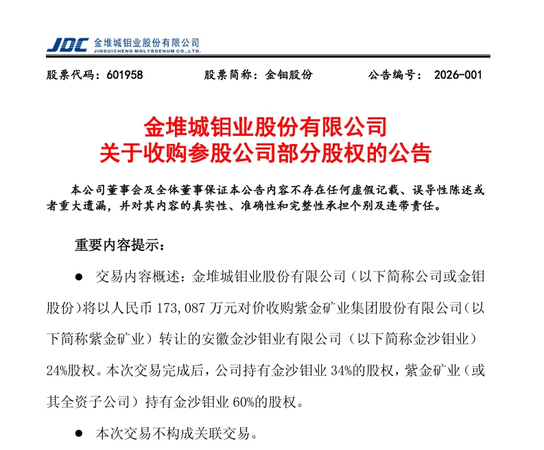 2026年1月,安徽金寨沙坪溝鉬礦迎來兩大關(guān)鍵節(jié)點(diǎn):本月19日,紫金礦業(yè)以17.3億元轉(zhuǎn)讓項(xiàng)目24%股權(quán)給金鉬股份,達(dá)成強(qiáng)強(qiáng)聯(lián)合開發(fā)共識。